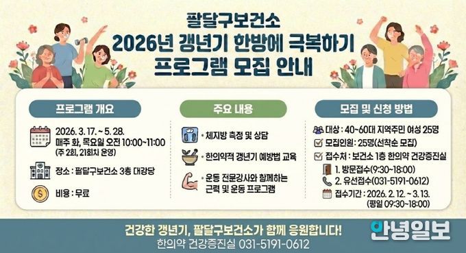 안녕일보 배윤 기자 | 수원시 팔달구보건소가 ‘2026년 갱년기 한방에 극복하기’ 프로그램에 참여할 40~60대 지역 여성을 3월 13일까지 모집한다.