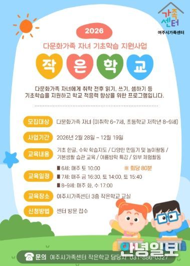안녕일보 배윤 기자 | 여주시가족센터는 다문화가족 자녀 기초학습 지원사업 ‘작은학교’를 운영한다고 밝혔다.