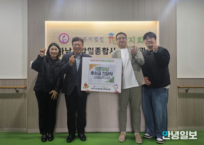 안녕일보 배윤 기자 | 어린이·청소년 교육 공연을 운영하는 전문업체 청춘마당은 지역 취약계층 지원을 위해 2월 11일 하남시감일종합사회복지관(사회복지법인 휴먼복지회 운영)에 후원금 1백만원을 전달했다.