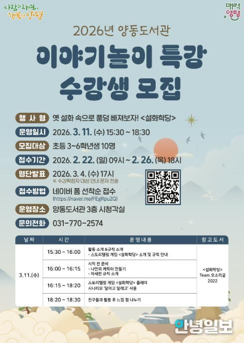 안녕일보 배윤 기자 | 양평군은 새 학기를 맞아 양동도서관에서 초등학생을 대상으로 운영하는 ‘이야기 놀이 특강’의 수강생을 오는 22일부터 26일까지 모집한다고 밝혔다.