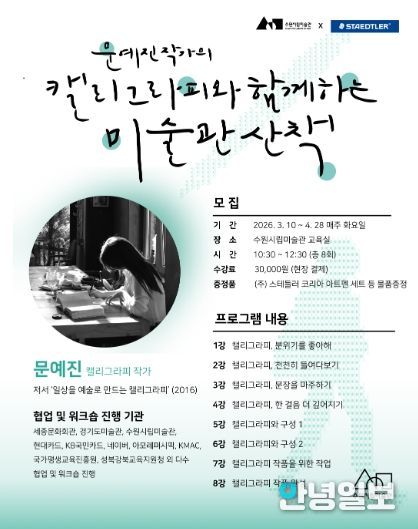 안녕일보 배윤 기자 | 수원시립미술관은 독일 문구 기업 ㈜스테들러 코리아와 공동으로 '캘리그라피와 함께하는 미술관 산책'을 3월 10일부터 4월 28일까지 운영하며 참가자를 모집한다.