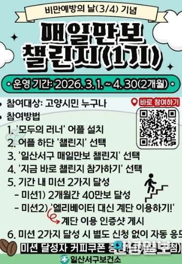 안녕일보 배윤 기자 | 고양특례시 일산서구보건소는 3월 4일 ‘비만예방의 날’을 기념해 지역주민의 건강생활 실천을 유도하고 비만 예방 분위기 확산을 위해 ‘매일만보 챌린지’를 3월 1일부터 4월 30일까지 2개월간 운영한다.