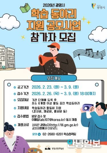 안녕일보 배윤 기자 | 광명시가 오는 3월 9일까지 ‘2026년 평생학습 동아리 지원 공모사업’에 참여할 30여 개 팀을 공개 모집한다.