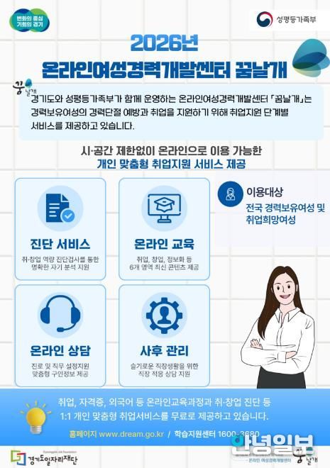안녕일보 배윤 기자 | 경기도가 경력보유여성 등 미취업여성의 경력단절을 예방하고 경제활동 참여를 지원하기 위해 ‘온라인 여성경력개발센터(꿈날개)’ 사업을 추진한다.