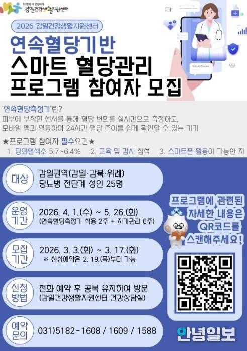 안녕일보 배윤 기자 | 하남시 감일건강생활지원센터는 당뇨병 전단계 주민의 생활습관 개선과 자가 혈당관리를 돕기 위해 ‘연속혈당 기반 스마트 혈당관리 프로그램’을 오는 4~5월 8주간 운영한다.