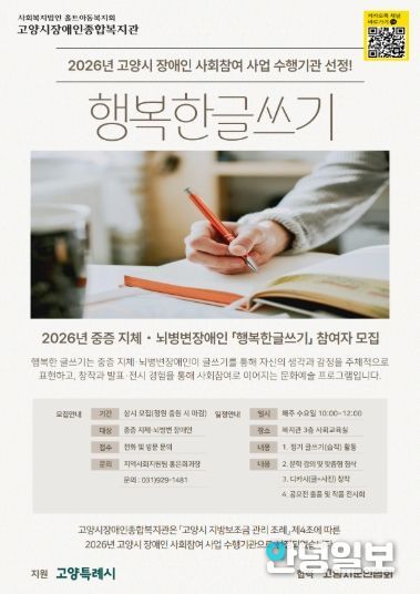 이번 선정은 '고양시 지방보조금 관리 조례' 제4조에 근거하며, 수행기관에 선정된 복지관은 올해 중증 지체·뇌병변장애인을 대상으로 한 문화예술 기반 사회참여 프로그램 ‘행복한 글쓰기’를 운영한다.