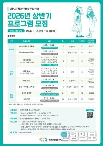 안녕일보 배윤 기자 | 이천시 청소년생활문화센터가 청소년과 지역주민의 건강한 생활문화 형성과 역량 강화를 위해 ‘2026년 상반기 프로그램’을 운영하고 수강생을 모집한다고 밝혔다.