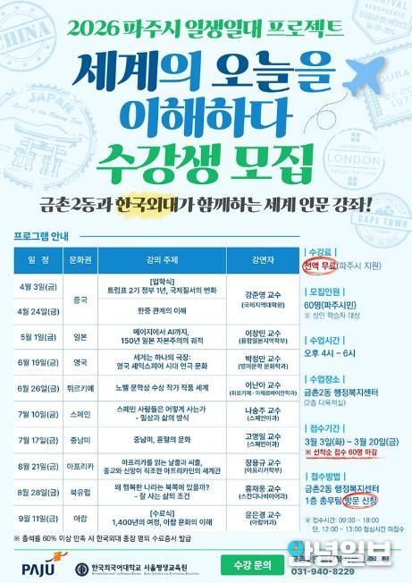 안녕일보 배윤 기자 | 파주시 금촌2동은 한국외국어대학교와 협력해 국제 정세와 세계의 논쟁거리를 조망하는 인문 강좌 ‘세계의 오늘을 이해하다’를 개설하고, 녪년 금촌2동-한국외대 일생일대 프로젝트’를 본격 추진한다.