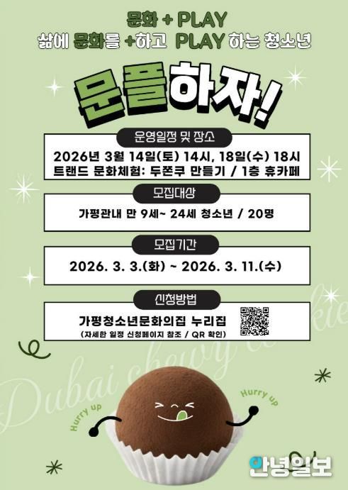 ‘문플(문화+PLAY)’은 ‘삶에 문화를 더하고 즐기는 청소년’이라는 주제로 청소년들에게 다양하고 폭넓은 문화 활동을 제공하는 프로그램이다. 이번 3차 프로그램은 ‘트렌드 문화체험: 두쫀쿠 만들기’로 진행된다.