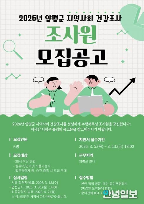 안녕일보 배윤 기자 | 양평군은 질병관리청 및 양평군보건소와 공동으로 추진하는 ‘2026년 지역사회 건강조사’에 참여할 조사원 6명을 모집한다고 밝혔다.