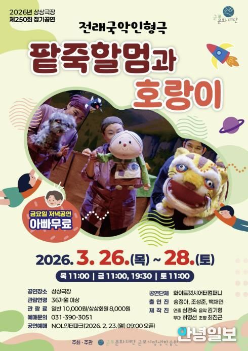 안녕일보 배윤 기자 | 군포문화재단 군포시평생학습원 상상극장은 2026년 정기공연의 첫 작품으로 전래국악 인형극〈팥죽할멈과 호랑이〉를 선보인다. 이번 공연은 오는 3월 26일부터 28일까지 상상극장에서 개최된다.