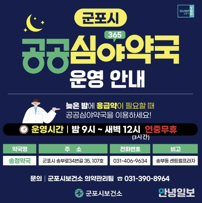 안녕일보 배윤 기자 | 군포시가 오는 3월부터 심야 시간 시민들의 의약품 구매 불편을 해소하고 안전한 투약 환경을 조성하기 위해 연중무휴 ‘공공심야약국’을 신규 지정·운영한다고 밝혔다.