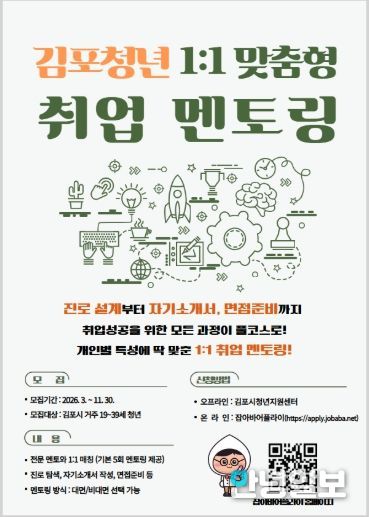 안녕일보 배윤 기자 | 김포시는 청년들의 취업 역량 강화를 위해 ‘2026년 김포 청년 1:1 맞춤형 취업 멘토링’ 참여자를 모집한다. 모집 기간은 3월 5일부터 11월 30일까지이며, 모집 인원 초과 시 조기 마감될 수 있다.