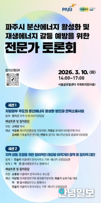 안녕일보 배윤 기자 | 파주시는 이클레이(ICLEI) 한국사무소와 함께 오는 10일 서울글로벌센터 국제회의장에서 ‘분산에너지 활성화 및 재생에너지 갈등 예방을 위한 전문가 토론회’를 개최한다.