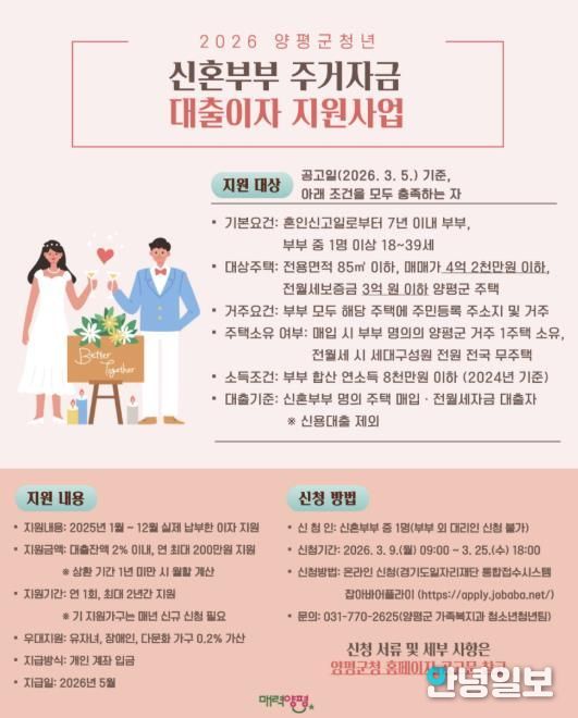 안녕일보 배윤 기자 | 양평군은 주택 매입 또는 임차(전월세) 자금 대출을 받은 양평군 거주 청년 신혼부부를 대상으로 연간 최대 200만 원의 대출이자를 지원하는 ‘2026년 양평군 청년 신혼부부 주거자금 대출이자 지원 사업’을 시행한다고 5일 밝혔다.