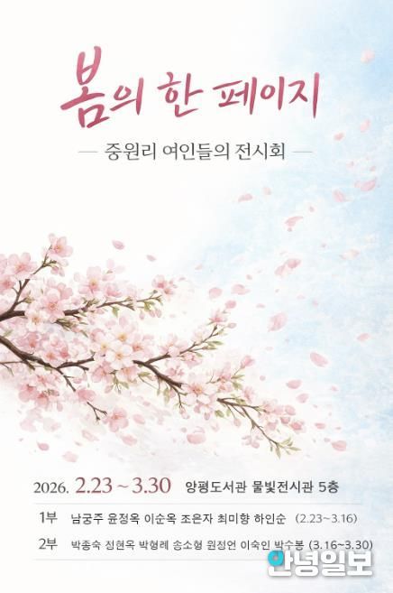안녕일보 배윤 기자 | 양평군은 양평도서관 5층 ‘물빛전시관’에서 용문면 중원리 여성 미술 동호회 회원들의 회화 전시 ‘봄의 한 페이지’를 개최한다고 밝혔다.