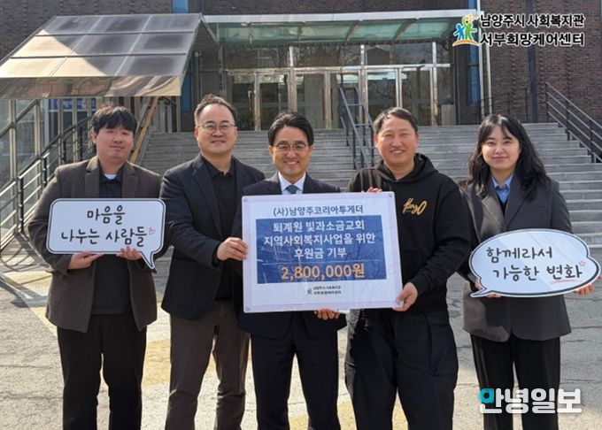안녕일보 배윤 기자 | 남양주시는 지난 4일 서부희망케어센터에서 (사)남양주코리아투게더와 퇴계원 빛과소금교회, 처갓집양념치킨 퇴계원점이 퇴계원 아동·청소년 외식지원사업 ‘매월일닭’후원금 전달식을 진행했다고 5일 밝혔다.