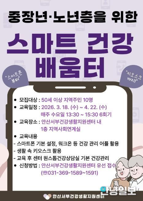 안녕일보 배윤 기자 | 안산시는 단원보건소 서부건강생활지원센터는 오는 18일부터 ‘중장년‧노년층을 위한 스마트 건강 배움터’를 운영한다고 6일 밝혔다.