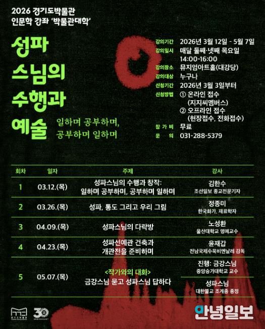 안녕일보 배윤 기자 | 경기도박물관은 오는 3월 12일부터 ‘2026 경기도박물관 박물관대학(인문학 강좌)’을 운영한다. 경기도박물관 박물관대학(인문학 강좌)은 매년 역사·문화와 관련한 시의성 있는 주제를 선정해 도민에게 제공하는 교육프로그램이다.