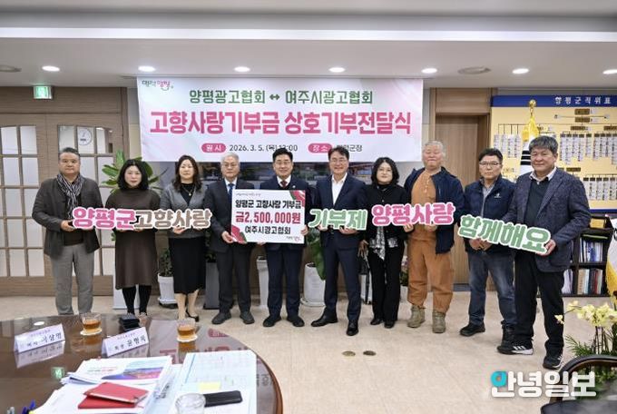 안녕일보 배윤 기자 | 양평군은 지난 5일 군수 집무실에서 양평광고협회와 여주시광고협회가 ‘고향사랑기부금 상호 기부식’을 진행했다고 밝혔다.