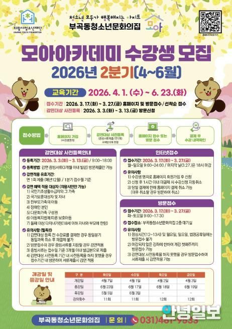 안녕일보 배윤 기자 | (재)의왕시청소년재단 부곡동청소년문화의집이 청소년들의 창의성과 실천 역량을 키우는 배움의 장을 조성하기 위해‘2026년 모아아카데미 2분기(4~6월)’ 수강생을 모집한다.