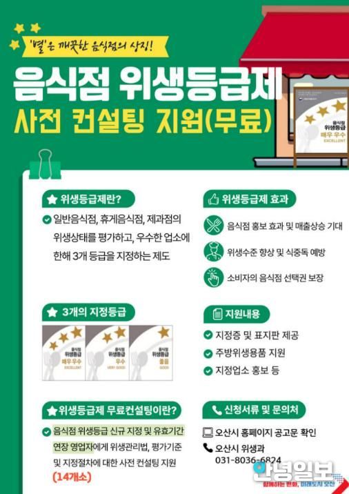 안녕일보 배윤 기자 | 오산시는 관내 음식점의 위생 수준 향상과 안전한 외식환경 조성을 위해 ‘음식점 위생등급제(식품안심업소) 사전 컨설팅’ 참여 업소를 모집한다고 10일 밝혔다.