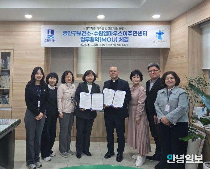 안녕일보 배윤 기자 | 수원시 장안구보건소와 수원 엠마우스는 10일 장안구보건소에서 업무협약을 체결하고, 취약계층 이주민 건강관리 지원을 위해 협력하기로 했다.