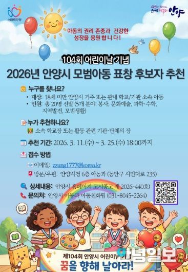 안녕일보 배윤 기자 | 안양시는 어린이날을 맞아 다양한 분야에서 모범이 되는 아동을 발굴하기 위해 ‘2026년 모범아동 유공 표창’ 후보자를 11일부터 25일까지 추천받는다고 11일 밝혔다.