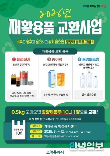 안녕일보 배윤 기자 | 고양특례시 덕양구 창릉동은 주민들의 자원 재활용 참여를 확대하고 올바른 분리배출 문화를 정착시키기 위해 ‘2026년 재활용품 교환사업’을 운영한다고 밝혔다.