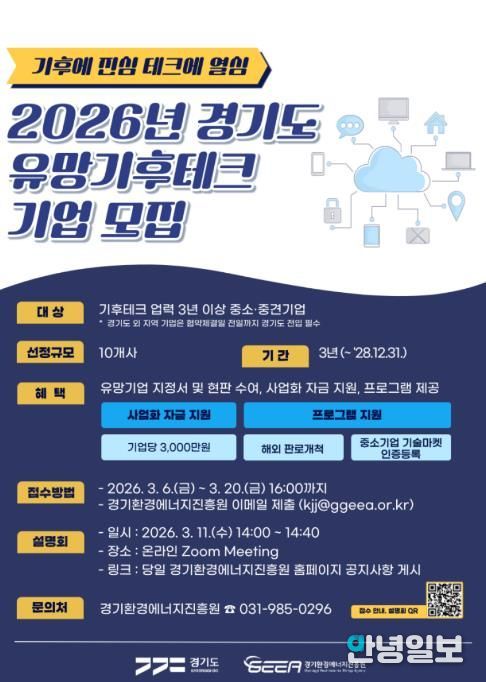 안녕일보 배윤 기자 | 경기도와 경기환경에너지진흥원이 기후위기 대응을 선도할 혁신 기술 보유 기업을 발굴하기 위해 오는 3월 20일까지 ‘2026년 경기도 유망 기후테크 기업’ 10곳을 모집한다.