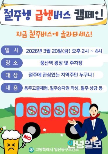 안녕일보 배윤 기자 | 고양특례시 일산동구보건소는 건전한 음주문화 조성과 지역주민의 건강증진을 위해 오는 20일 오후 2시부터 4시까지‘절주행 급행버스 캠페인’을 운영한다.