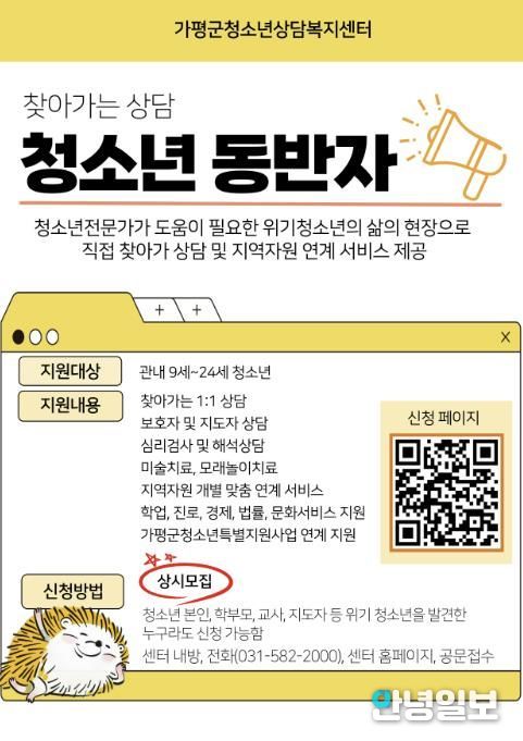 안녕일보 배윤 기자 | 가평군청소년상담복지센터는 청소년 상담 분야 자격과 경험을 갖춘 전문상담사가 위기 청소년을 지원하는 ‘청소년동반자 프로그램’을 운영중이라며 적극적인 이용을 당부했다.