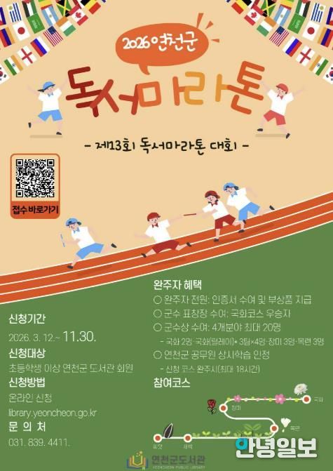 안녕일보 배윤 기자 | 연천군 도서관은 지난 12일부터 11월 30일까지 ‘제13회 독서마라톤대회’를 운영한다. 이번 대회는 책을 통한 군민 간 소통과 공감, 독서 문화 확산을 목적으로 한다.