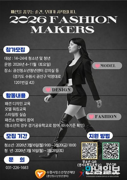 안녕일보 배윤 기자 | 수원시청소년청년재단 권선청소년청년센터는 패션 분야 진로에 관심 있는 청소년과 청년을 대상으로 ‘패션메이커스(Fashion Makers)’ 프로그램 참가자를 모집한다.