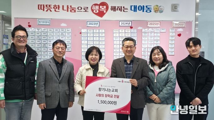 김근선 대야동장은 “꾸준히 지역사회를 위해 나눔을 실천해 주시는 향기나는교회와 김호윤 목사에게 깊이 감사드린다”라며 “전달해 주신 장학금은 대야동 지역사회보장협의체를 통해 대학생과 중·고등학생 가구를 선정해 소중히 전달하겠다”라고 말했다.