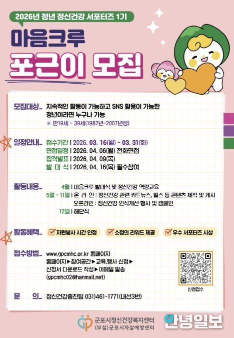 안녕일보 배윤 기자 | 군포시정신건강복지센터는 지역사회 정신건강 인식 개선과 생명존중 문화 확산을 위해 청년 정신건강 서포터즈 1기 ‘포근이’를 3월 16일부터 3월 31일까지 모집한다.