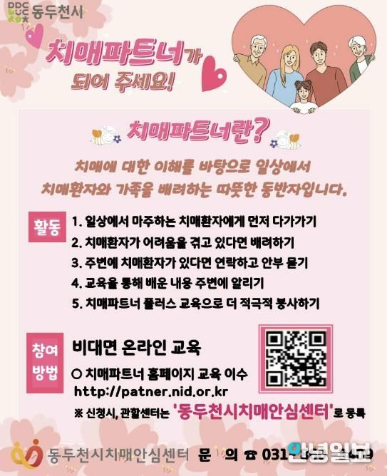 안녕일보 배윤 기자 | 동두천시보건소 치매안심센터는 치매에 대한 부정적 인식을 개선하고 돌봄 문화 확산으로 치매 친화적 환경을 조성하기 위해 ‘치매파트너’ 양성 대상자를 상시 모집한다고 밝혔다