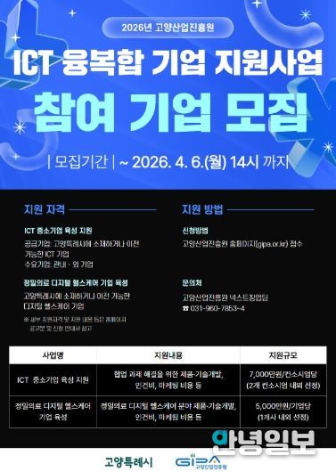 안녕일보 배윤 기자 | 고양산업진흥원이 ‘2026 고양 ICT 융복합 지원사업’ 참여 기업을 모집한다.
