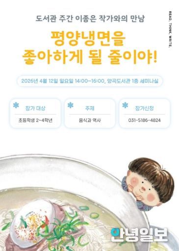 안녕일보 배윤 기자 | 양곡도서관은 ‘『평양냉면을 좋아하게 될 줄이야』를 읽고 우리 음식 속에 숨은 가슴 시린 역사를 마주해 보아요’라는 주제로 '이종은 작가와의 만남'을 오는 4월 12일 오후 2시에 개최한다.