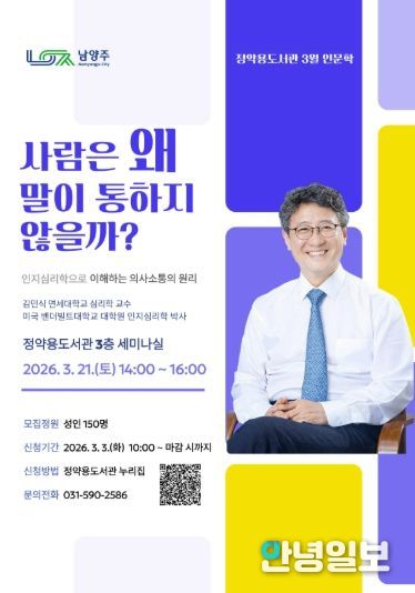 안녕일보 배윤 기자 | 남양주시는 오는 21일 정약용도서관 3층 세미나실에서 시민 150명을 대상으로 인문학 강연 ‘사람은 왜 말이 통하지 않을까’를 개최한다고 16일 밝혔다.