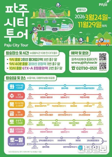 안녕일보 배윤 기자 | 파주시는 봄철을 맞아 오는 24일부터 '2026년 파주시티투어’를 운행을 개시한다.