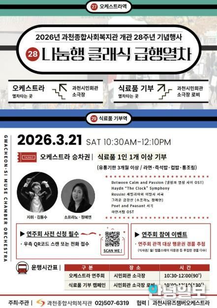 안녕일보 배윤 기자 | 과천시는 과천종합사회복지관이 오는 3월 21일 과천시민회관 소극장에서 개관 28주년을 기념한 오케스트라 연주회 ‘28번역 나눔행 클래식 급행열차’를 개최한다고 밝혔다.