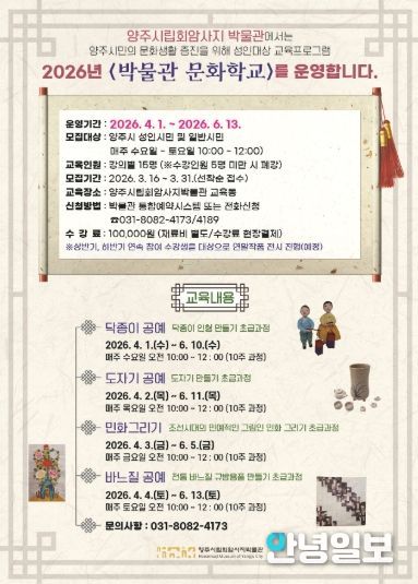 안녕일보 배윤 기자 | 양주시립회암사지박물관은 오는 3월 31일까지 시민들의 문화 향유 기회를 확대하고 문화예술 활동 참여를 활성화하기 위해 상반기 ‘2026 박물관 문화학교’ 수강생을 모집한다.