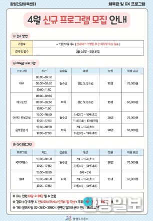 안녕일보 배윤 기자 | 광명도시공사는 광명건강체육센터에서 시민들의 건강 증진과 생활체육 활성화를 위해 체육관 및 GX실 4월 신규 프로그램 회원을 모집한다고 밝혔다.