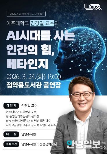 안녕일보 배윤 기자 | 남양주시는 오는 3월 24일 정약용도서관 공연장에서 시민 300여 명을 대상으로 도시인문학 특강 ‘AI시대를 사는 인간의 힘, 메타인지’를 개최한다고 17일 밝혔다.