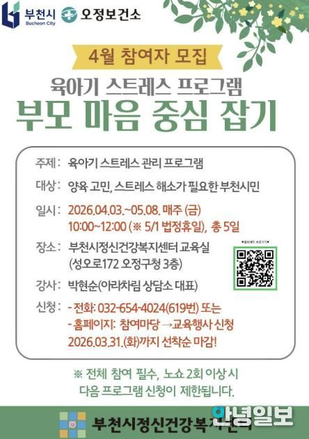 송정원 부천시보건소장은 “양육 과정에서 부모들이 겪는 스트레스와 감정을 건강하게 돌보는 것이 중요하다”며 “이번 프로그램이 부모들이 서로 공감하고 마음의 균형을 찾는 시간이 되길 바란다”고 말했다.