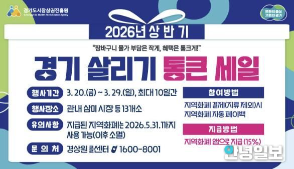 안녕일보 배윤 기자 | 시흥시는 고물가로 위축된 민생경제에 활력을 불어넣고 소상공인의 매출 증대를 돕기 위해 오는 3월 20일부터 29일까지 관내 전역에서 ‘2026년 상반기 경기 살리기 통큰 세일’을 개최한다.