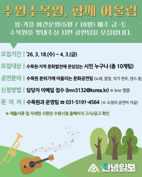 안녕일보 배윤 기자 | 수원특례시가 수원수목원에서 열리는 시민 참여 문화공연 ‘수원수목원, 함께 어울림’에 참여할 시민 공연팀을 4월 3일까지 모집한다.