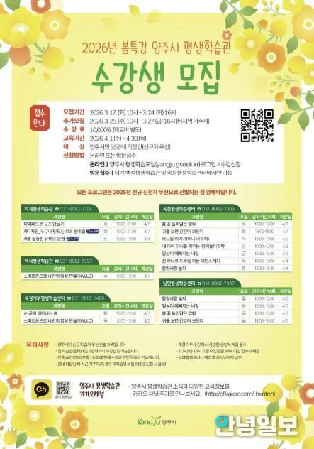 수강 신청은 오는 3월 24일 16시까지 가능하며, ‘양주시 평생학습포털’을 통한 온라인 신청 또는 덕계·백석 평생학습관 및 옥정 평생학습센터 방문 접수로 가능하다.