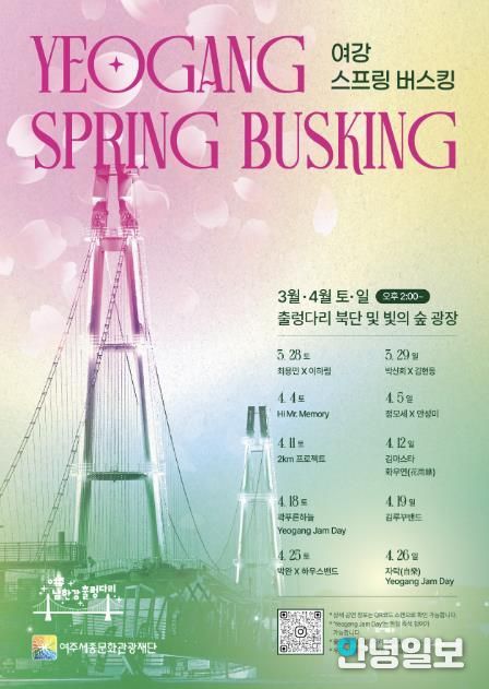 안녕일보 배윤 기자 | 여주세종문화관광재단은 남한강의 수려한 자연경관과 출렁다리 경관을 배경으로 시민과 관광객에게 색다른 문화 향유 기회를 제공하기 위해 ‘2026년 상반기 여주 남한강 출렁다리 버스킹 공연’을 운영한다고 밝혔다.